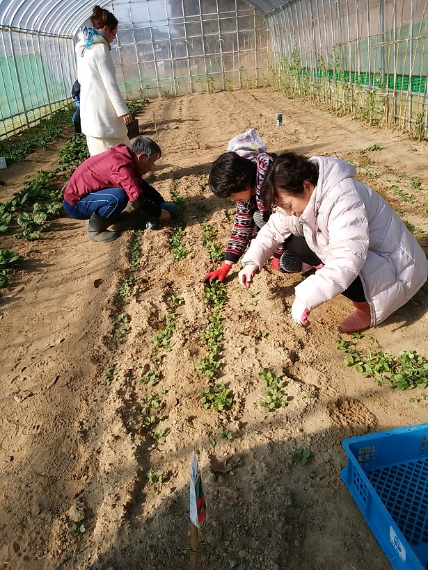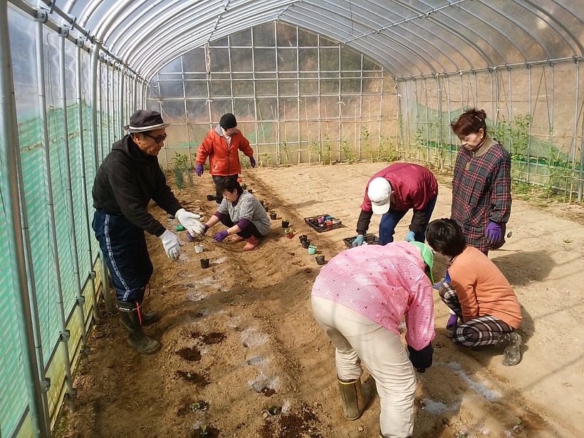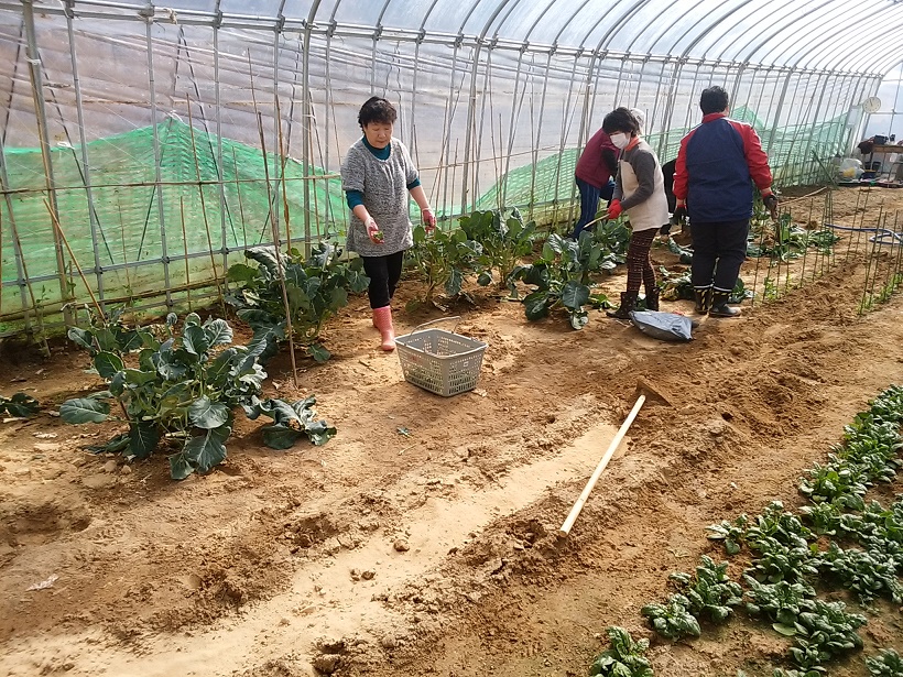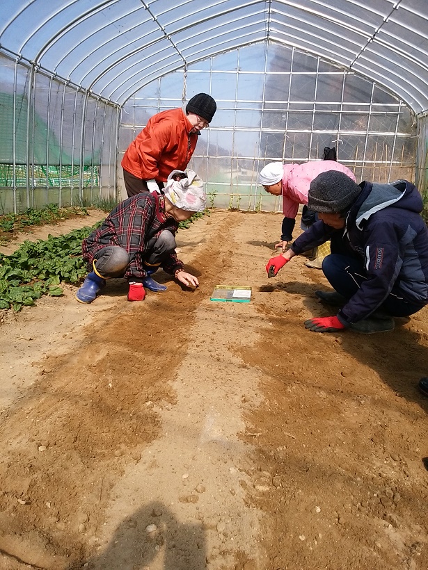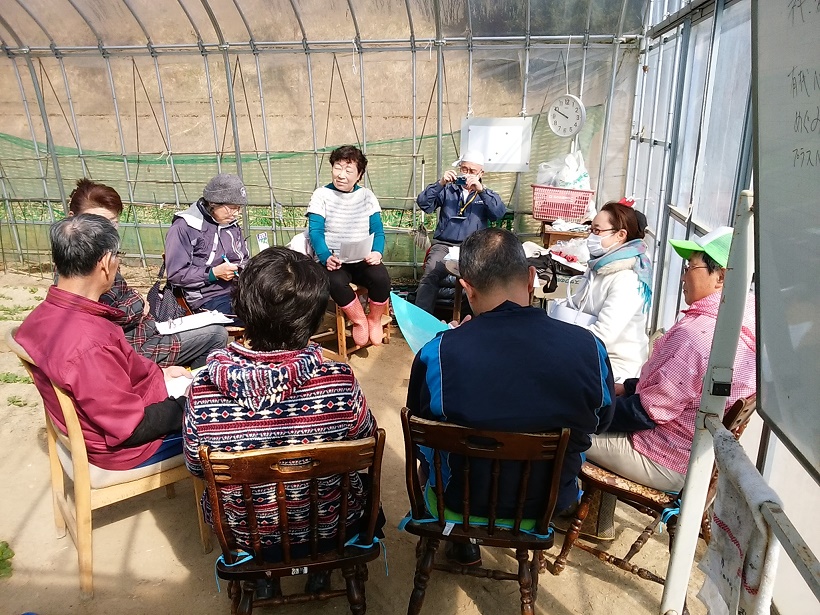 雪が舞ったり、陽が射したりと変化の激しいなか、ハウスの中での運営会議。一年間の農園プロジェクト活動の振り返るを参加者で語り合う。1週間に一回、農園に出てくることが楽しみで、みんなと話をしながらの野菜作りが楽しくストレス解消になったこと、土づくりや野菜の育て方などここでの活動で勉強になったことなどの感想が出されました。まもなく、農園活動も3年を終えるところです。来年度も楽しく活動が続けられますように。