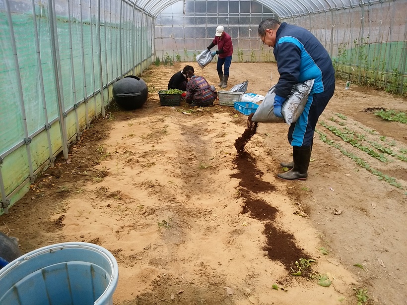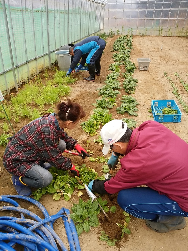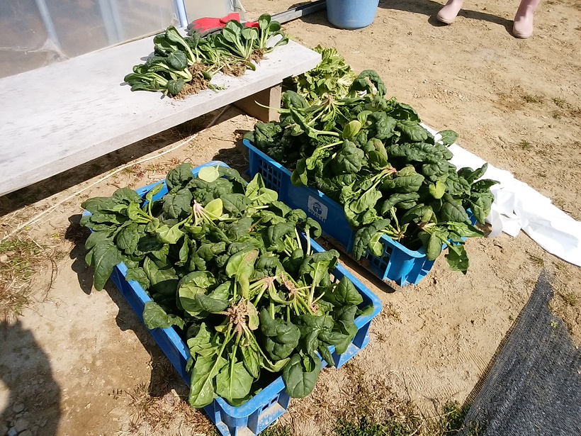 ほうれん草、ミズナ、チヂミ菜を収穫し、霙混じりの雨で露地は作業ができないため、ハウス内だけの土づくり。菌体、VS堆肥、有機ペレットをこぜ込みました。来週は、露地での土づくりとハウス内の播種作業を予定しています。
