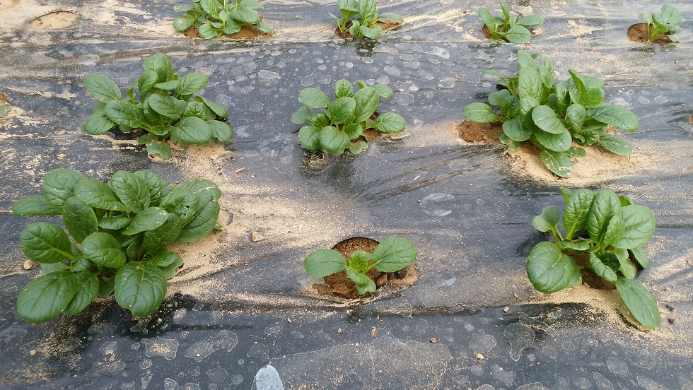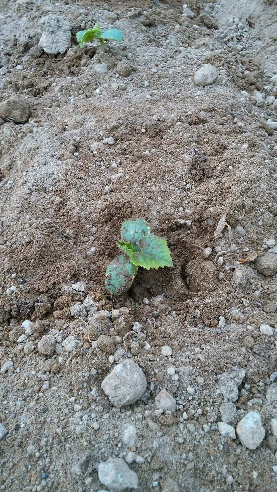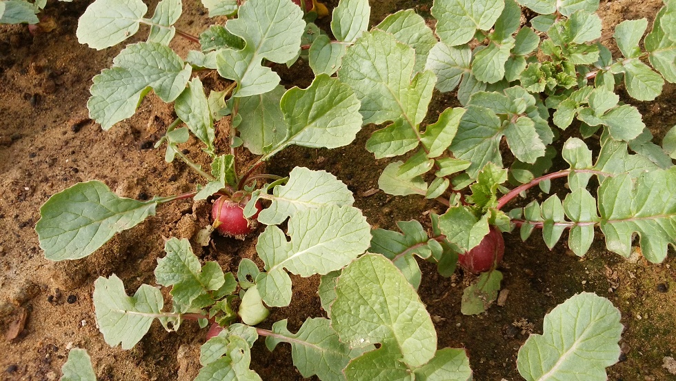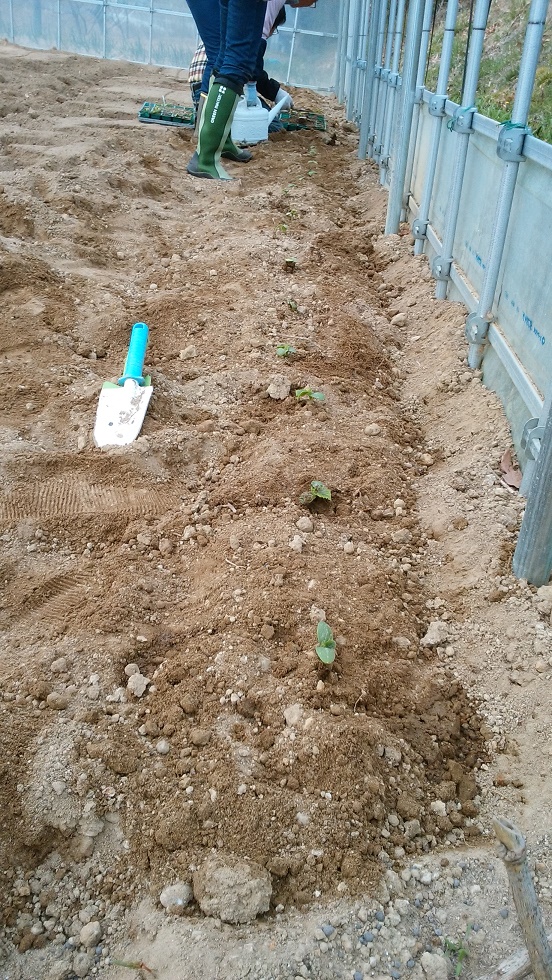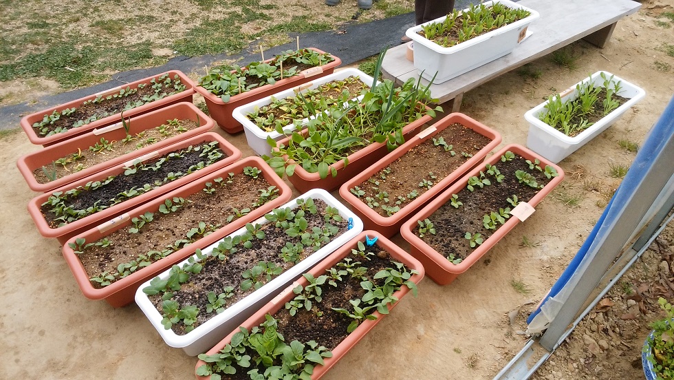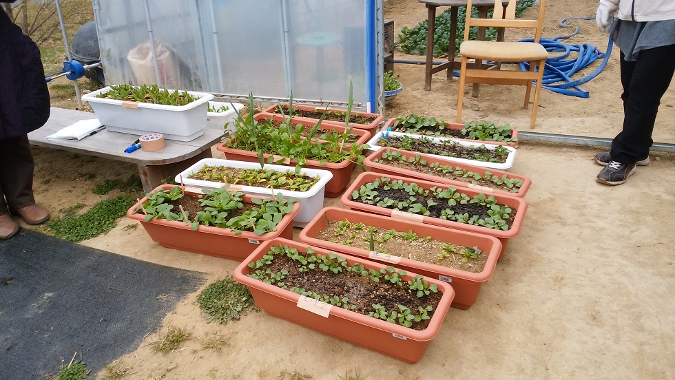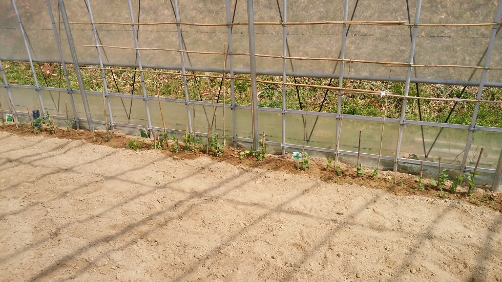 ハウスの野菜たち。チヂミ小松菜はだいぶ大きくなってきました。ラディシュ、白カブは食べごろです。キュウリは本葉を出し始めています。キヌサヤもそろそろネットを掛けてやらないと・・・。