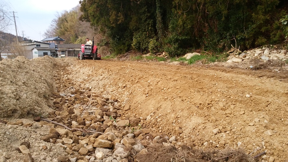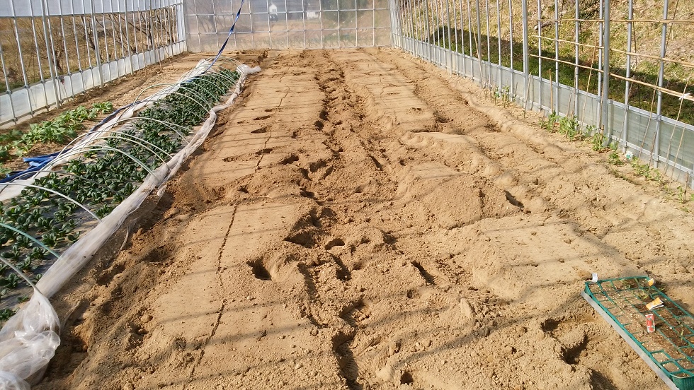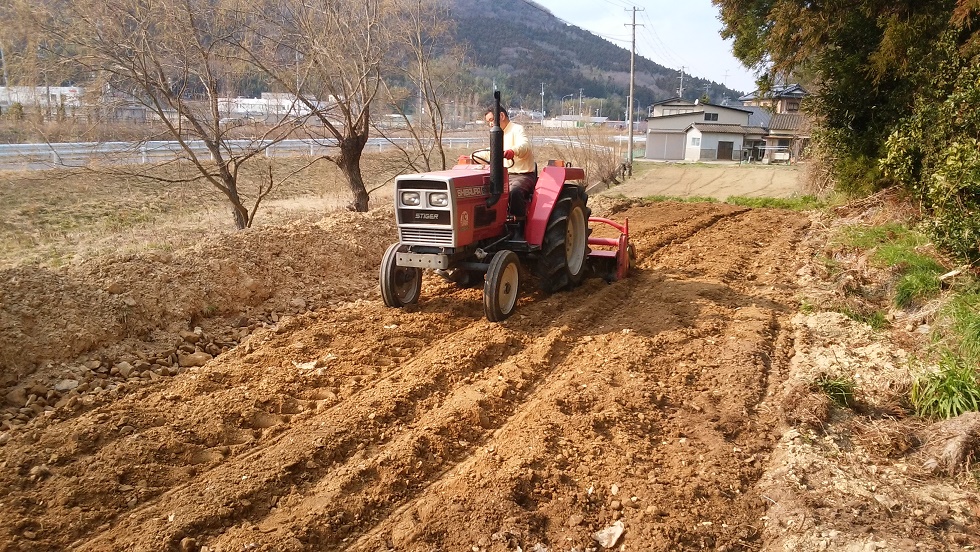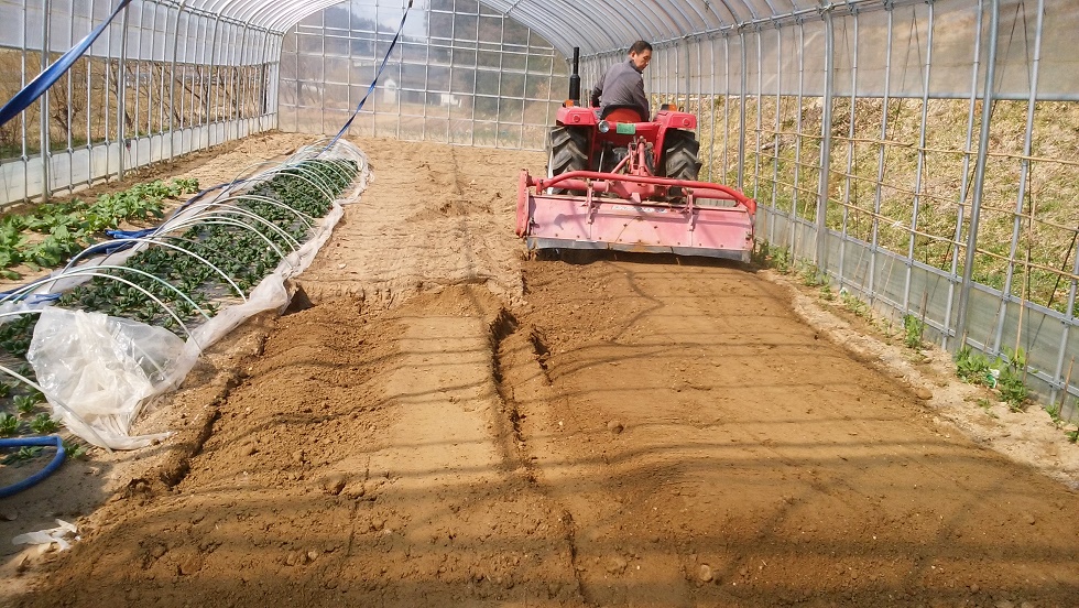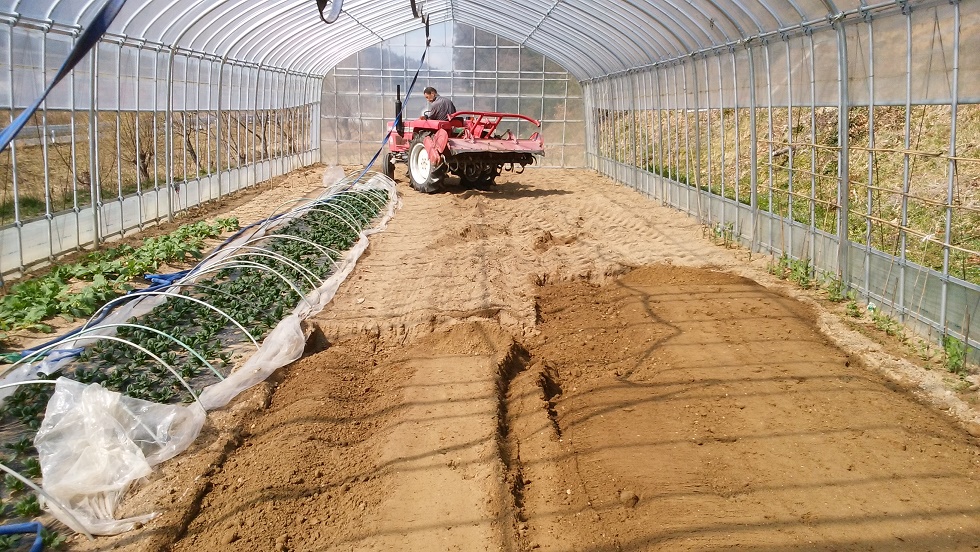 春陽麗和な季節到来です。午前中は、北側の石拾い。だいぶ畑らしくなってきました。まだ石はありますが、あと2日くらいで目途をつけ、菌体を入れ土づくりに入る予定です。午後からは、ハウスの中もトラクターで耕起。ふわふわな土になりました。