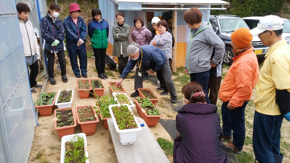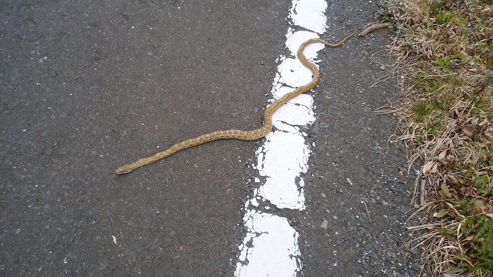 ポッカポッカの日曜日になった4月3日、プランターで栽培している野菜の「品評会」を農園で開催しました。米のとぎ汁や薄めた牛乳を与えたり、部屋や庭先などそれぞれの環境で育てた野菜の見せ合いです。ジャガイモの芽が出ている方やラディシュが食べごろになっている方とか様々。お互い情報を交流、交換して楽しいひと時を過ごしました。陽気にさそわれて、シマヘビが道路の出てきましたが思ったより寒かったのか動けずにいました。 (-_-;)