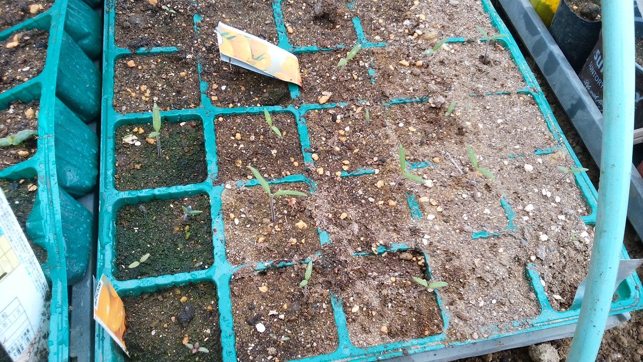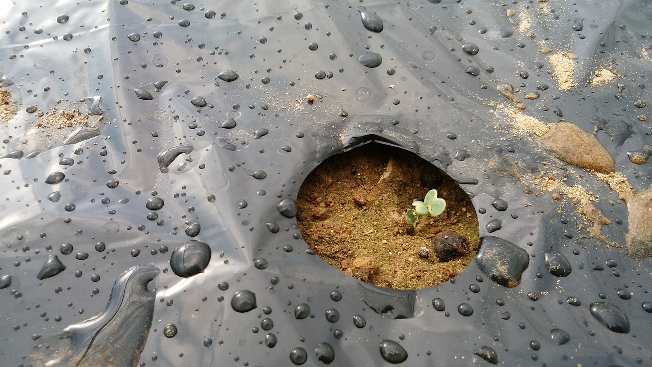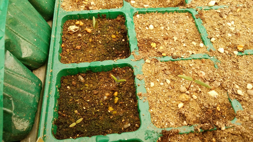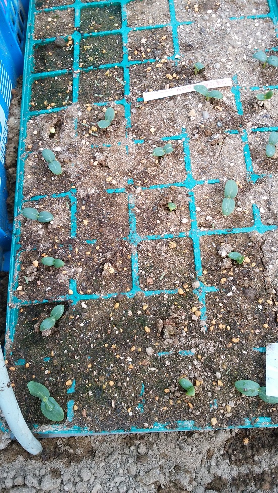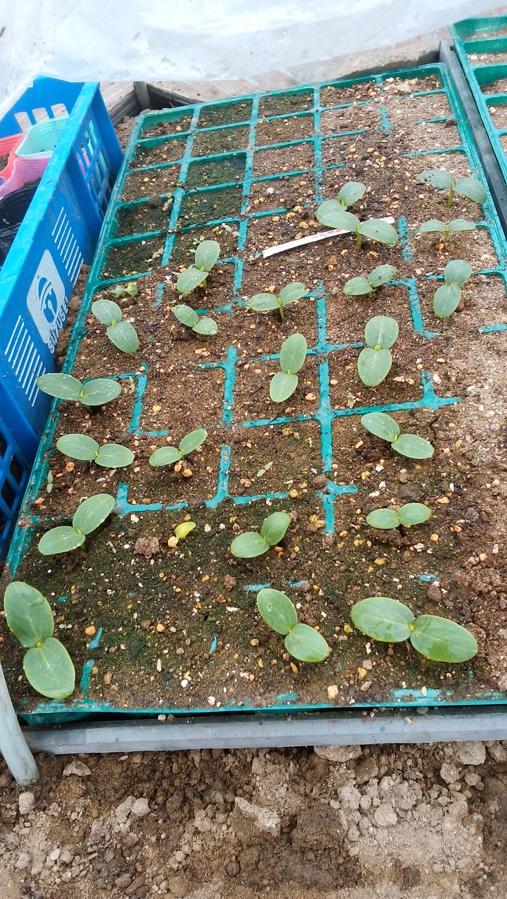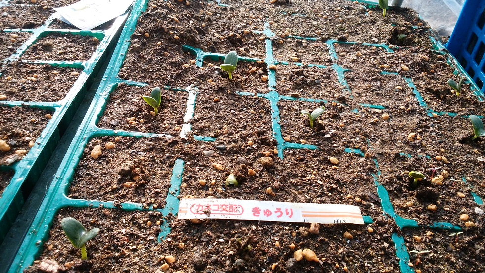 運営会議終了後、明日から暖かくなりそうなので、用水からポンプでくみ上げ、ハウス内に散水しました。2月17日に撒いたきゅうりが新芽を出していました。小松菜も順調に伸びています。