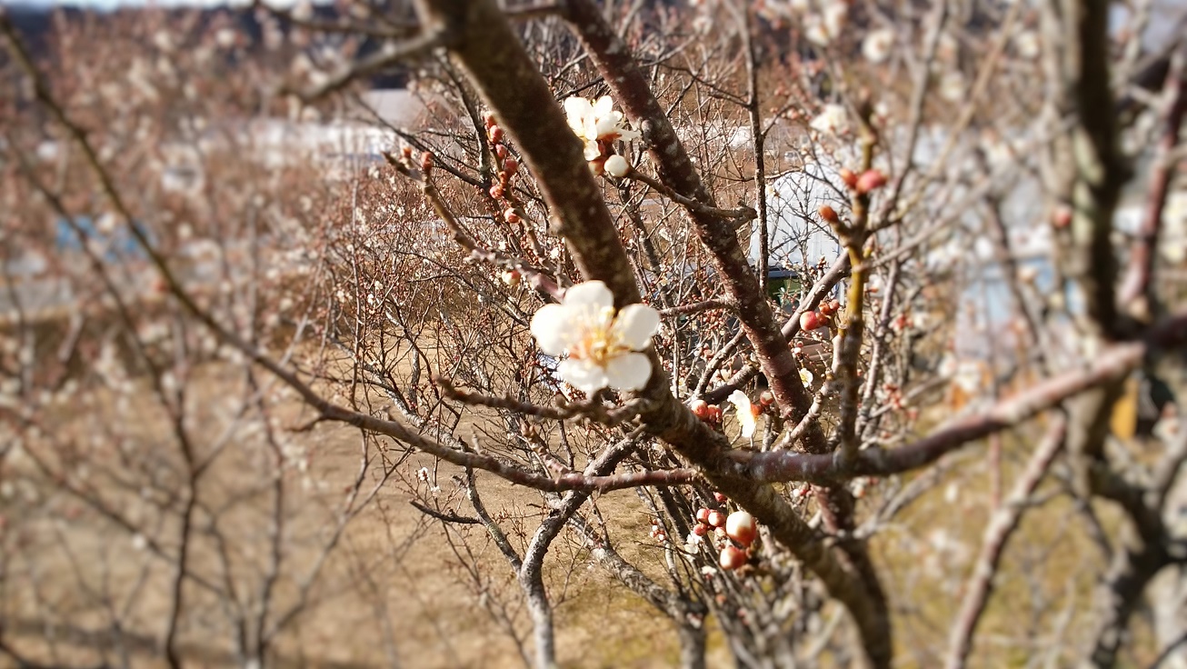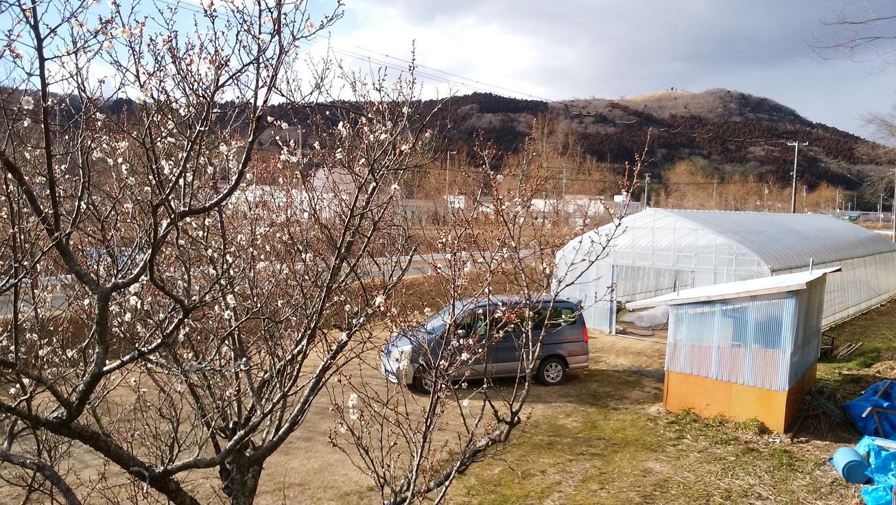 ビニールのトンネルの中は、ポッカポカ。チヂミ小松菜が新芽を出していました。農園入口の梅がかなり開花していたのに気が付きました。寒さが続きますが、確実に春が近づいているようです。梅と農園と馬っこ山のショットはいかがでしょう?R.Hさんが、大谷地の用水路の土手でバッケ(フキノトウ)を取ってきたので少し分けて頂きました。