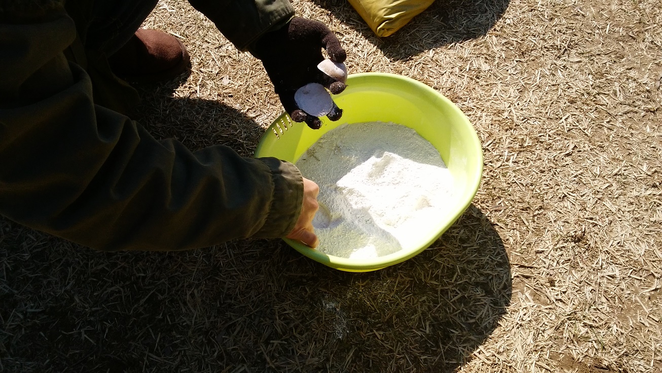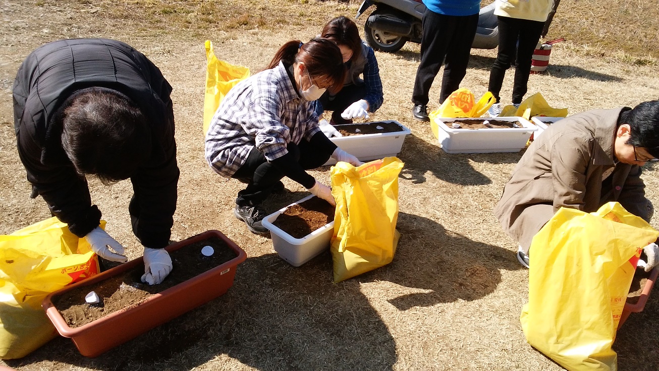 2月28日、微生物農法の土づくり講習会を農園で行いました。20名を超える参加者で、やさしい春の陽をあびながらの作業。プランターに培養土を入れ、種イモ(ジャガイモ)の切り口にホタテ貝殻でつくったカルシウムをたっぷり付けて植え込み、両脇には二十日大根の種を撒きました。ジャガイモが育ち収穫できるまで3か月~4か月かかるので、1か月~1か月半くらいで食べられる二十日大根をその間に収穫することで2度楽しめる植え付けをしました。最後に、微生物農法でつくったリンゴのジュースの試飲、生のダイコンとニンジンの試食、ダイコン、ピーマン、黒ニンニクのドライ野菜を参加者で味わいました。