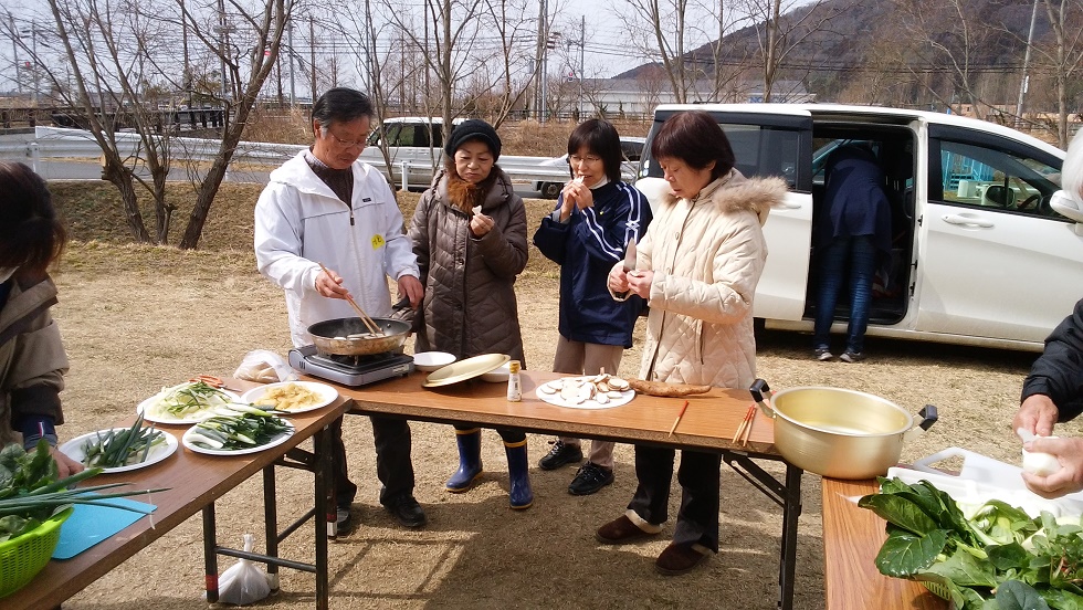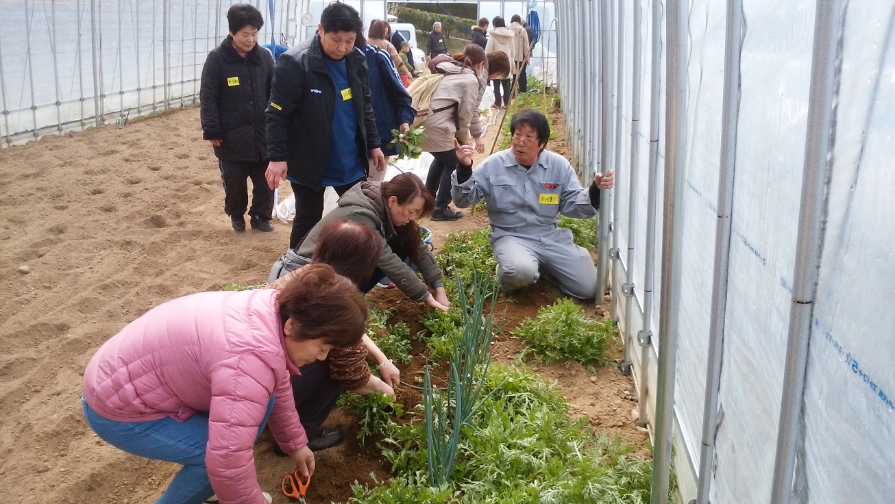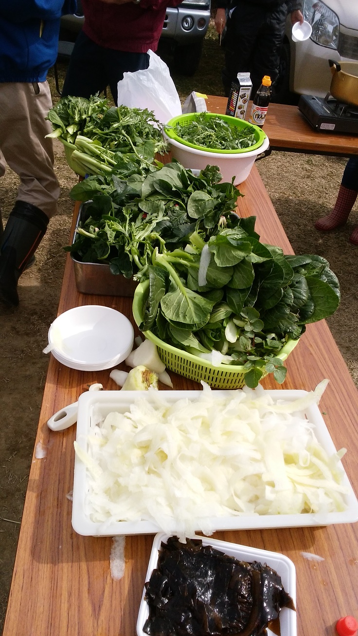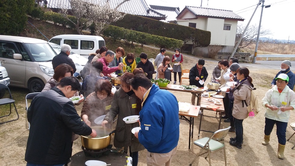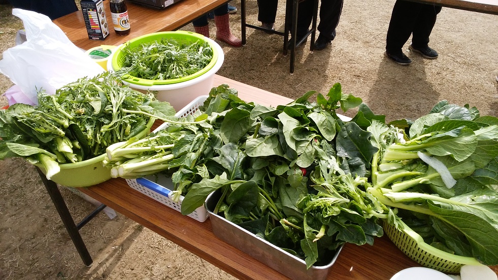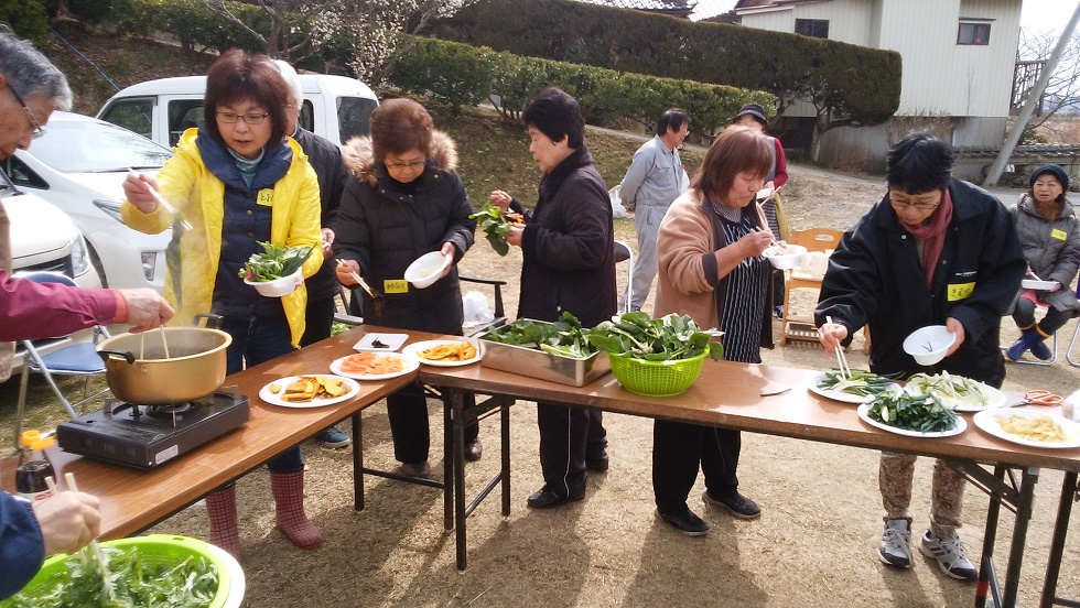 3月13日、農園で栽培した野菜を収穫し、しゃぶしゃぶで食する「収穫祭」を30名を超える参加者で楽しく、美味しく開催しました。東松島市東名地区で被災しながらも仮設住宅で被災者支援をしているHさんが、同じく宮戸島大浜で被災し、自宅から漁具の果てまで津波で流されるも仮設から浜に通い、漁業の再建を図るOさんが今朝水揚げしたばかりのワカメを届けていただき、「ワカメしゃぶしゃぶ」にしてごちそうになりました。参加者のみなさんは、美味しい野菜とワカメに大満足でした。Hさん、Oさん、共に地域の復興、心の復興に向けて手を取り合いながら一歩づつ進んでいきましょう!