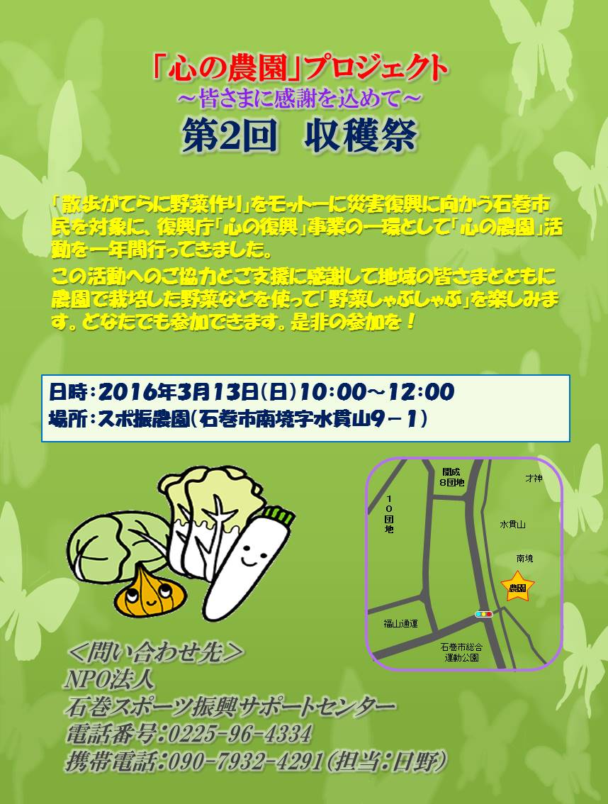 月日が経つのが早く感じますが、真冬の3月を迎えましたね。さて、今年度も最後の月になりました。「心の農園」プロジェクトも皆さまのご協力とご支援でなんとか一年間活動を展開することができました。その感謝と地域の皆さんとの交流を兼ねて、今年度2回目の「収穫祭」を開催いたします。農園で育てた野菜で「野菜しゃぶしゃぶ」での親睦・交流を深めます。ぜひみなさま、ご参加ください。参加費は無料で~す!