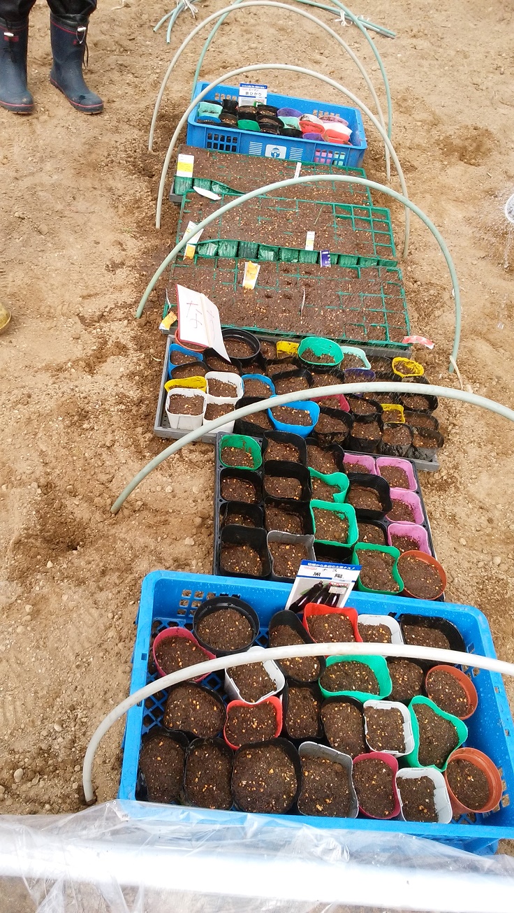 今日は、穴あけマルチビニールを土にかけ、チヂミ小松菜の種を撒き、防寒用のビニールを掛けトンネルにしました。ミニトマト、キューリ、ピーマン、ナスの種をポットに一粒づつ参加者で播きこちらもトンネルを掛け、発芽を待ちます。元気に育ちますように (^_-)-☆