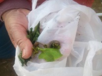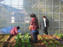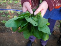 野菜を見てみると少し間引いた方が良いということで小松菜を間引き、春菊をかいて少し早いプチ収穫祭気分を味わいました。