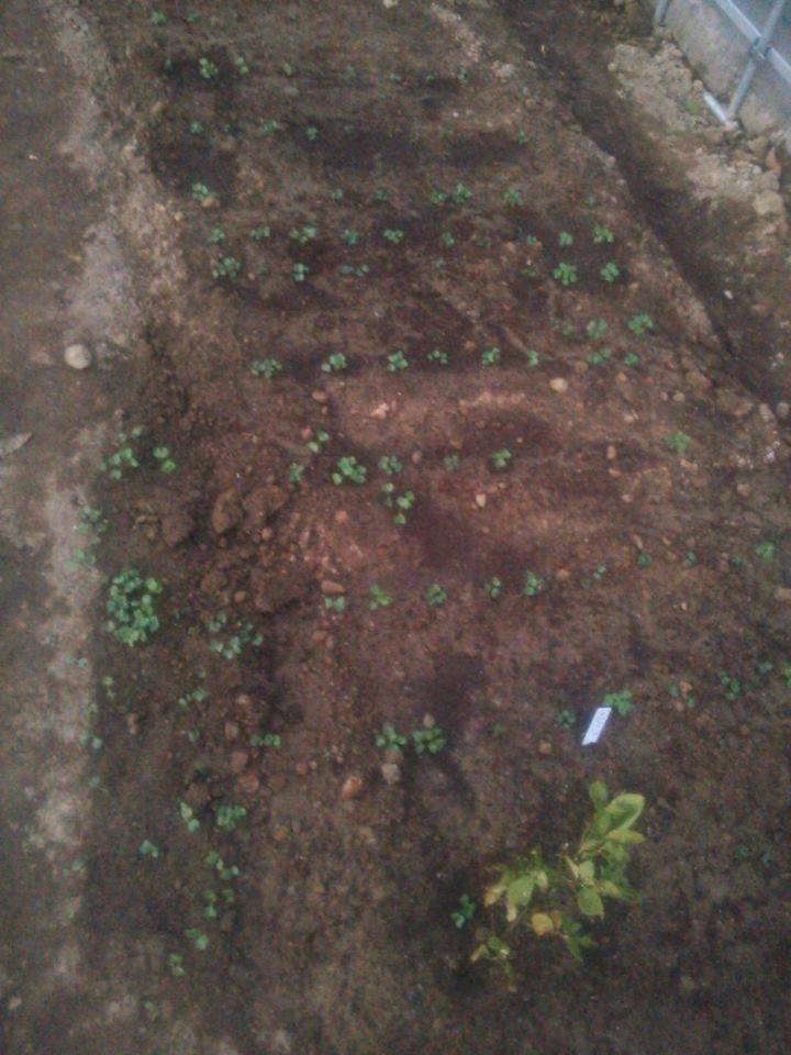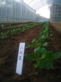 写真は種まきの際に種をこぼしてしまったラディッシュ(笑)と、青々と育っている小松菜です。