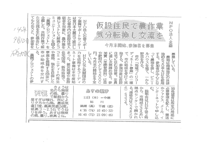 本日(9月10日)の石巻かほく紙に農園プロジェクトの記事が掲載されました。