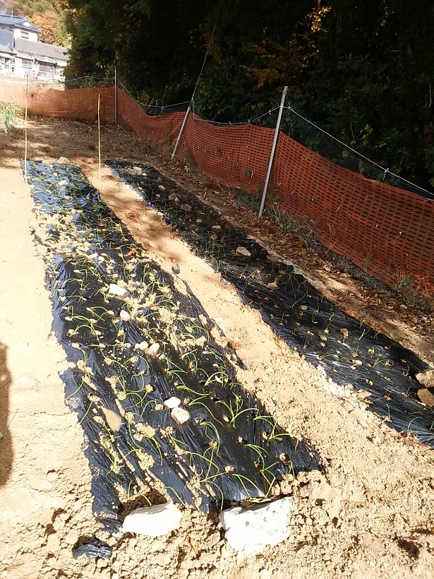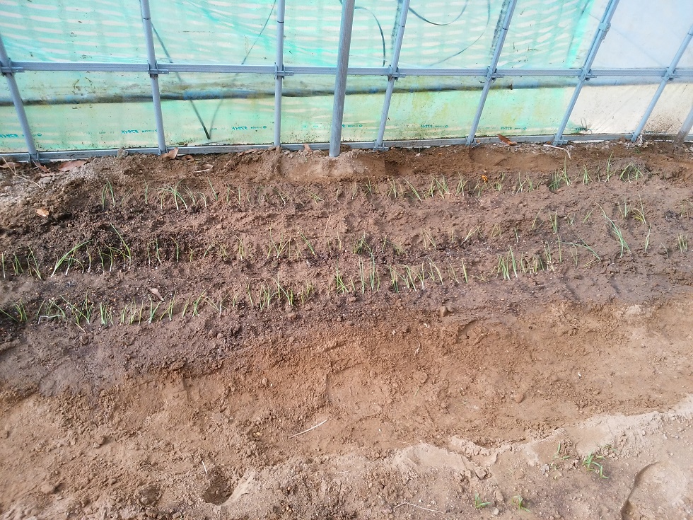 北西の強風が吹く中で、 今年最後の玉ねぎ苗を新たに250本購入し定植しました。ハウスには、ほうれん草、ちぢみ菜、ミズナノ種を播き、キヌサヤとスナップエンドウをポットに撒きました。