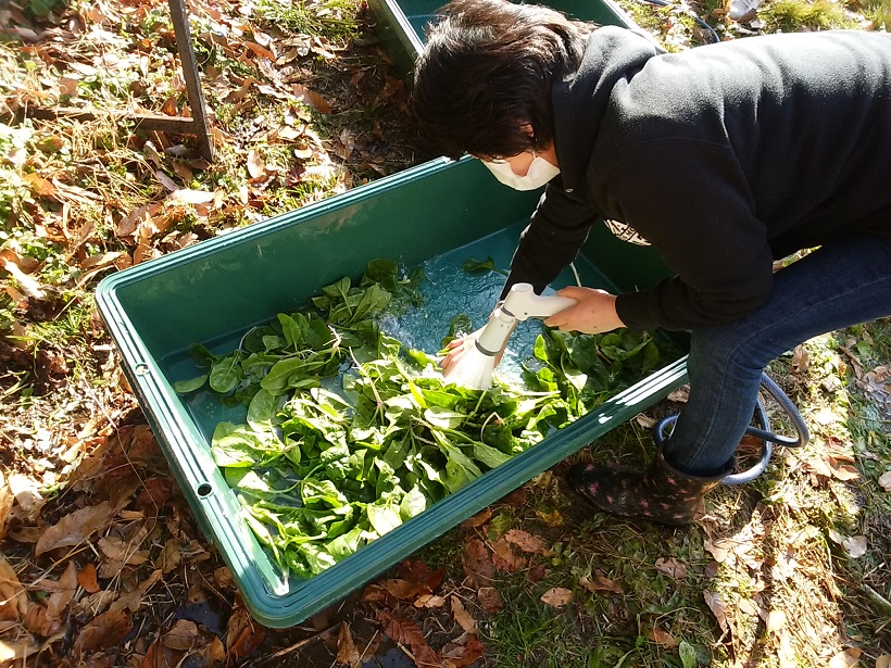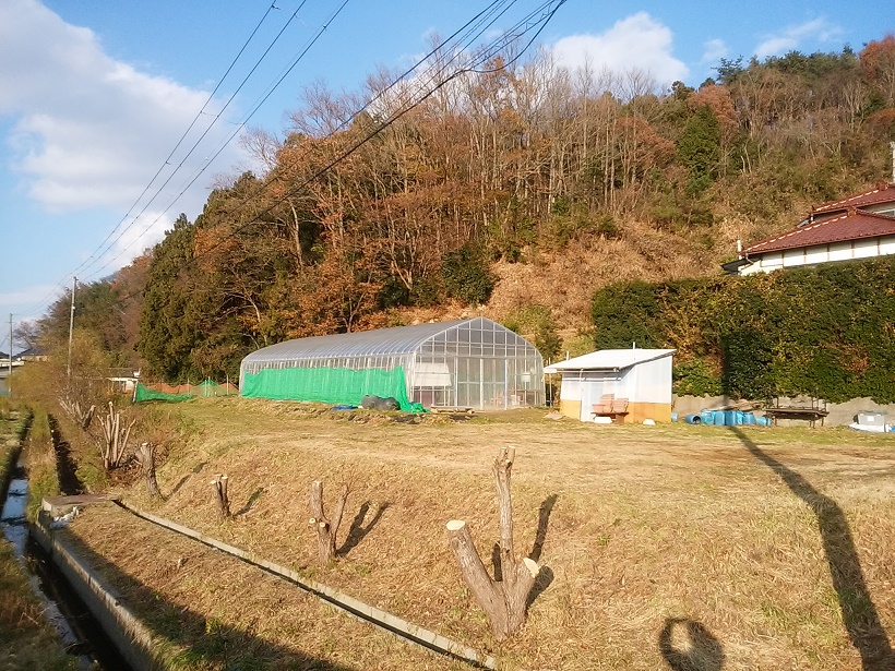 農園の柳の木が、正月飾り用のまゆ玉の材料にするために伐採され、ビニールハウスが道端から見えるようになりました。スッキリしたというか丸見えというか、複雑です。ハウスのなかは、ほうれん草が食べられるくらいになり、後撒きのほうれん草やミズナ、チヂミ菜も発芽し始めています。