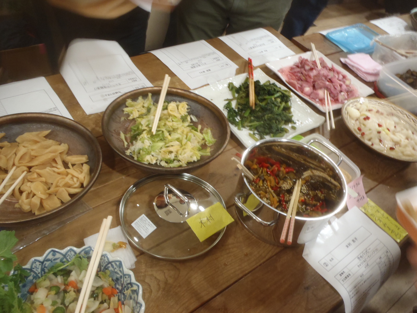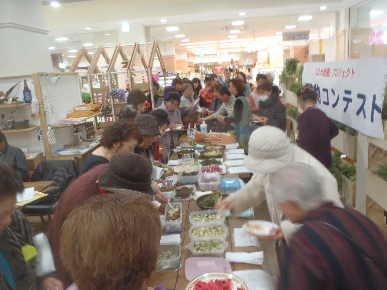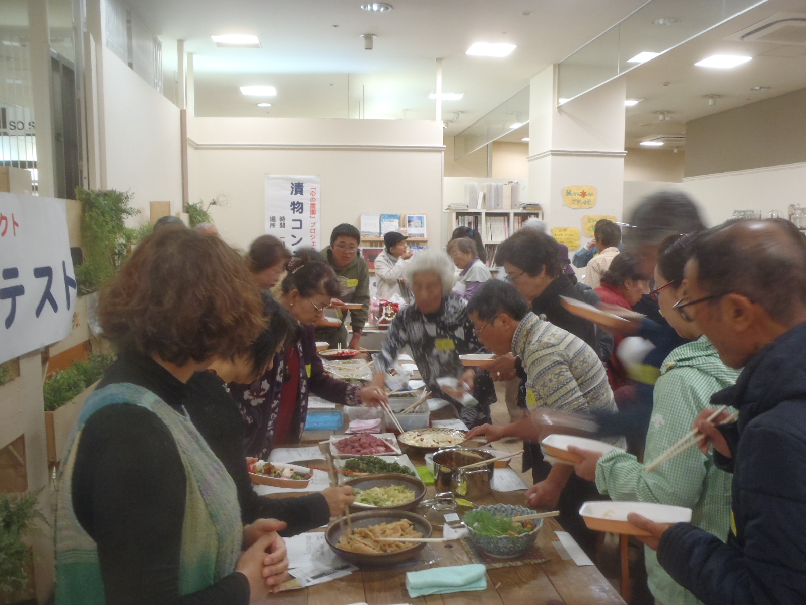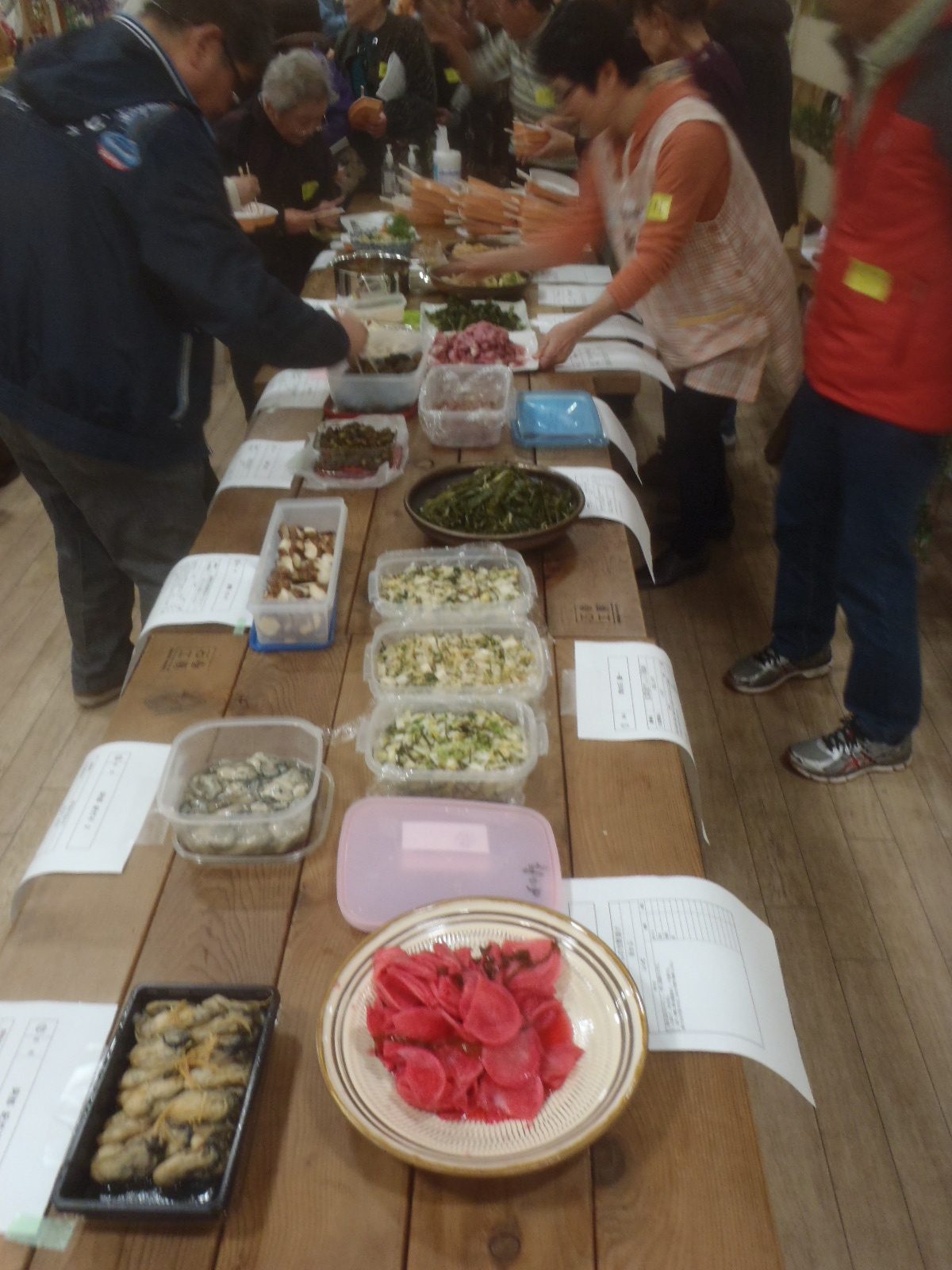 漬物コンテストを開催しました。出品者が増えずチョット焦っていましたら、締切り間際に応募が殺到し予定の15品に。当日の来場者が審査委員。審査委員も40名を超え、会場は「ポケモン効果?」もあり大盛況。(参加者は高齢者が圧倒的でしたが。(-_-;)。みなさんに美味しく実食して頂き、投票。結果は、グランプリには、OKさん作成の「きくいものぬか漬け」、準グランプリには、OTさん作成の「玉ねぎ甘酢漬け」、特別賞には、WYさんの「きゅうり甘漬け」が決まり、農園で育てた野菜や宮城復興局やコンテストに協賛して頂いた企業から寄せられた景品をお渡ししました。