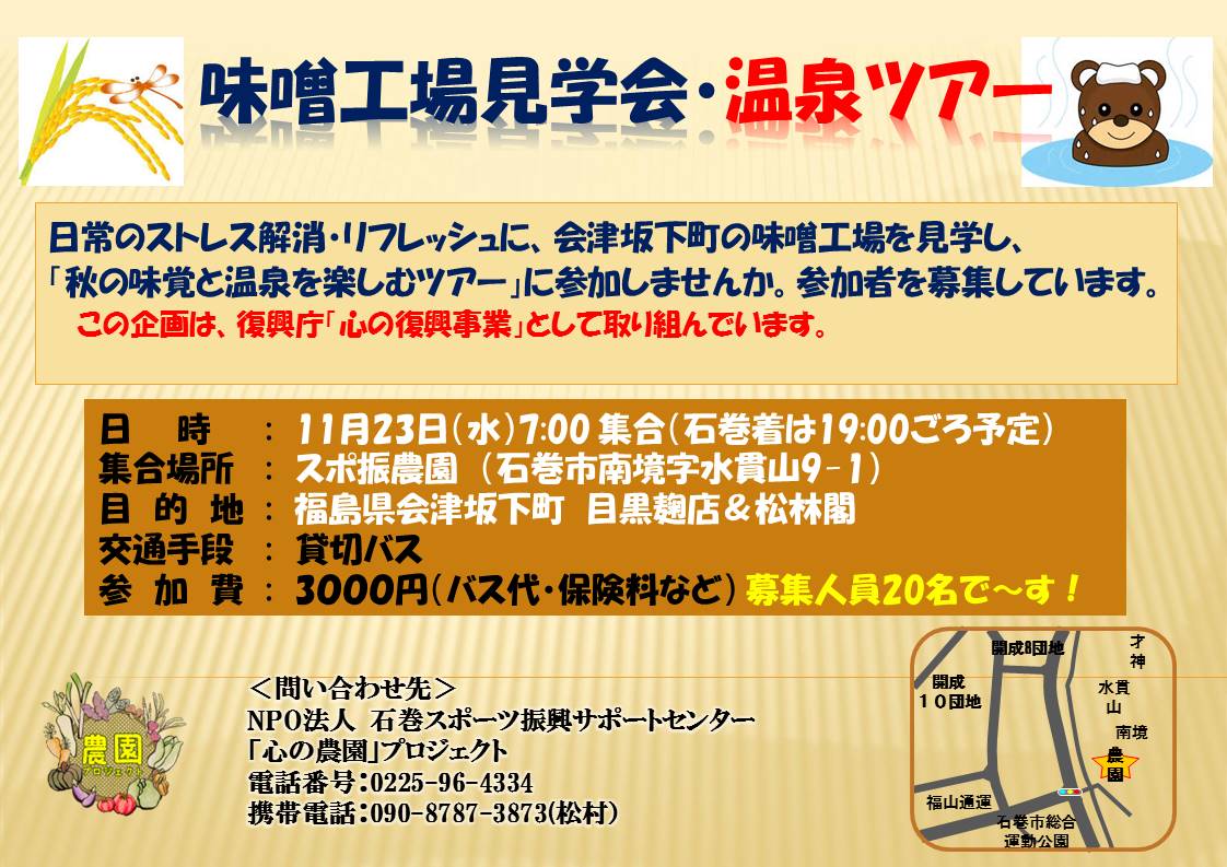 23日、会津坂下町の麹屋(味噌工場)の見学会と新蕎麦を食べ、温泉を楽しむツアー。農園を予定通り、朝7時に出発。磐越道の会津へ入る峠はミゾレ、会津盆地は薄曇りの天気でした。3時間で麹店に到着し、麹の香りが漂う味噌工場で天然酵母の麹で作った甘酒と漬物を頂きながら会津坂下町と麹の話しを聞く。味噌や麹をお土産に買い、店主に紹介された柳津福満虚空藏菩薩圓藏寺を参拝し、会津坂下の十割更科新蕎麦を食べ、温泉を楽しみました。帰りには、雪雲の間から磐梯山が顔を出してくれました。
