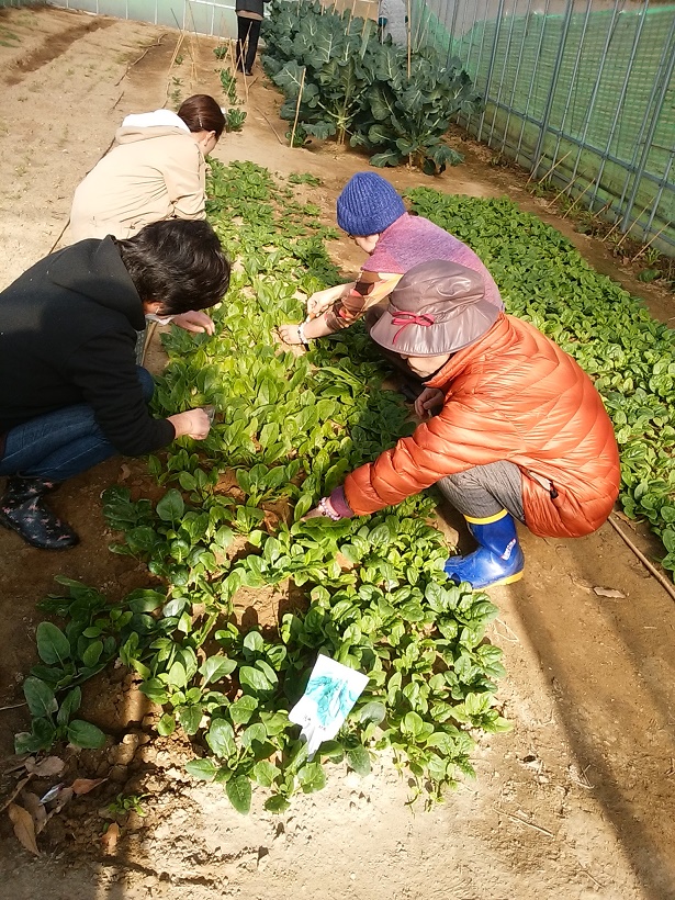 今日は、農園活動日。外は冬型の気圧配置で寒いですが、ハウスの中は作業をすると汗ばむほどの温度。ポットで育てていたネギとキヌサヤ、スナップエンドウが程よく成長したのでハウス内に定植しました。ブロッコリー、ほうれん草、ユキナを収穫し、参加者で分け合いました。
