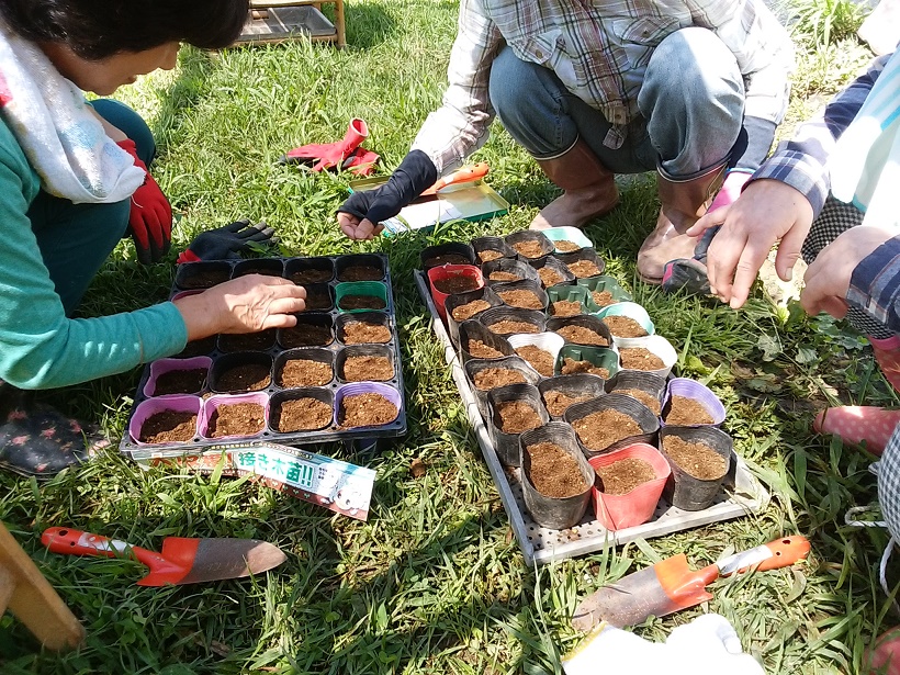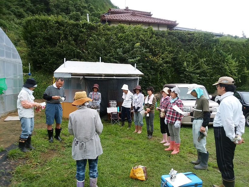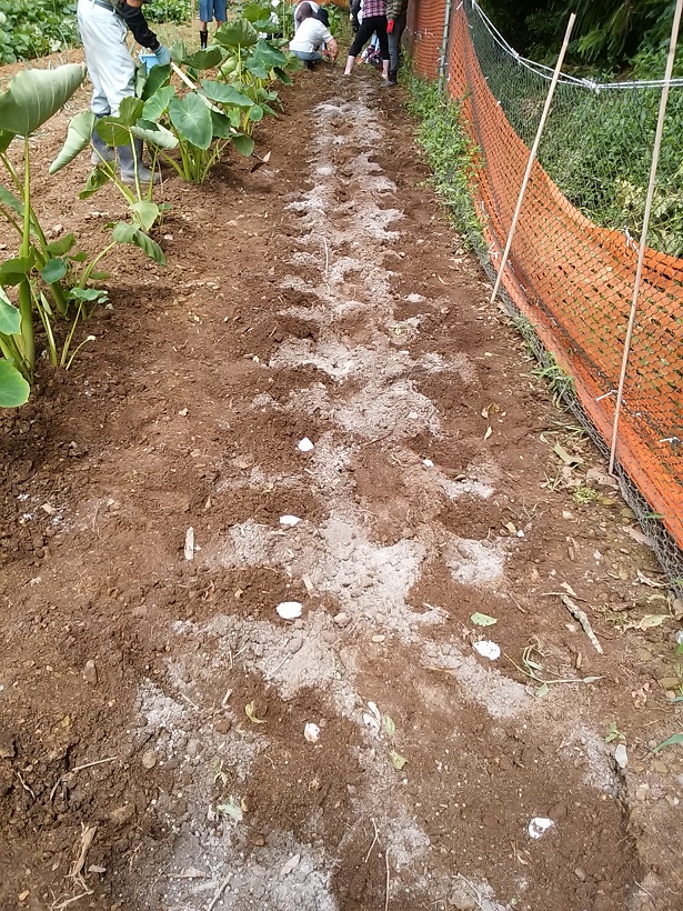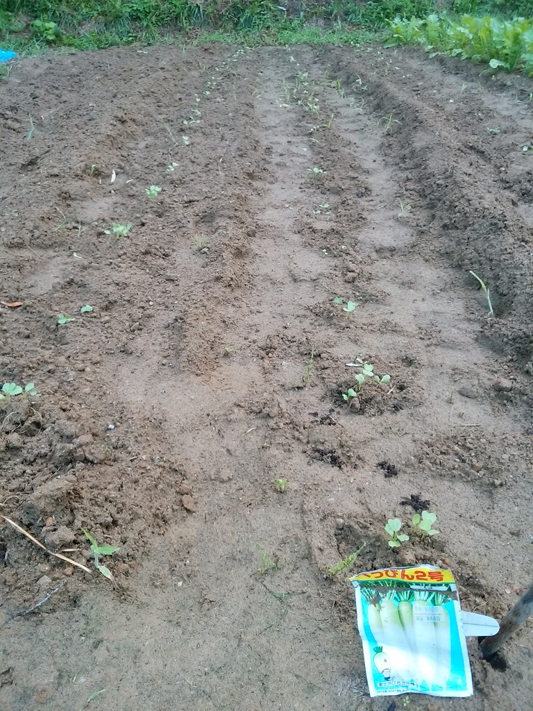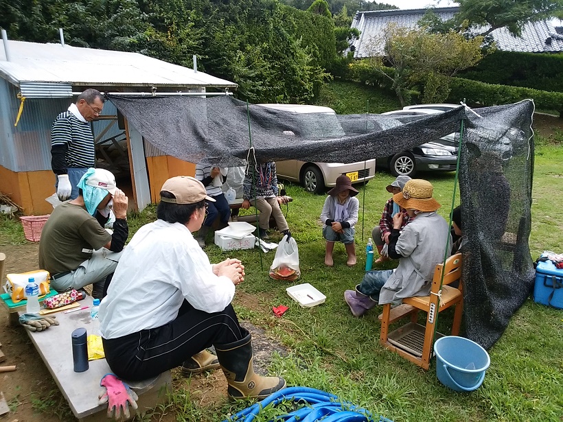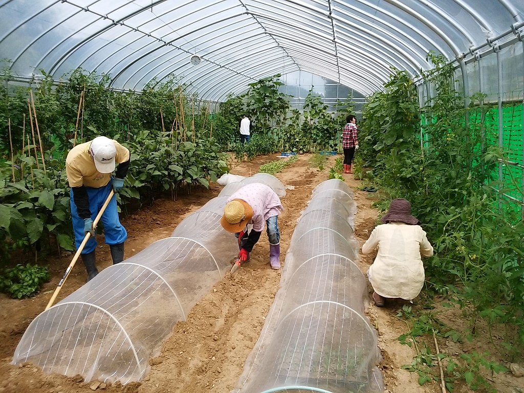 お盆休み明けの農園で運営会議を開催しました。会議後、頂いたスイカと農園で収穫したスイカで水分補強。ダイコンを間引き、除草作業を行い、Wさんの「手作りフルーツゼリー」でお茶っこタイム。その後、ジャガイモの収穫と秋ジャガイモの植え付けを行いました。ハウスの中の野菜も収穫し参加者で分け合いました。