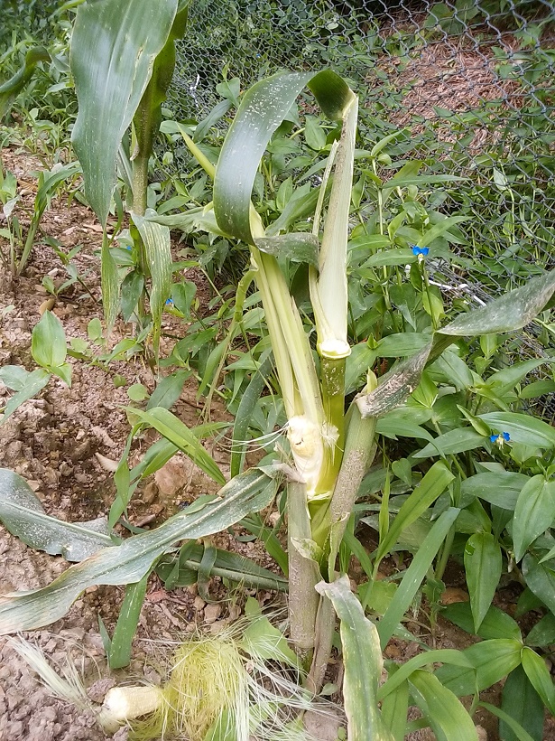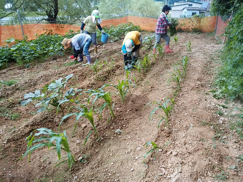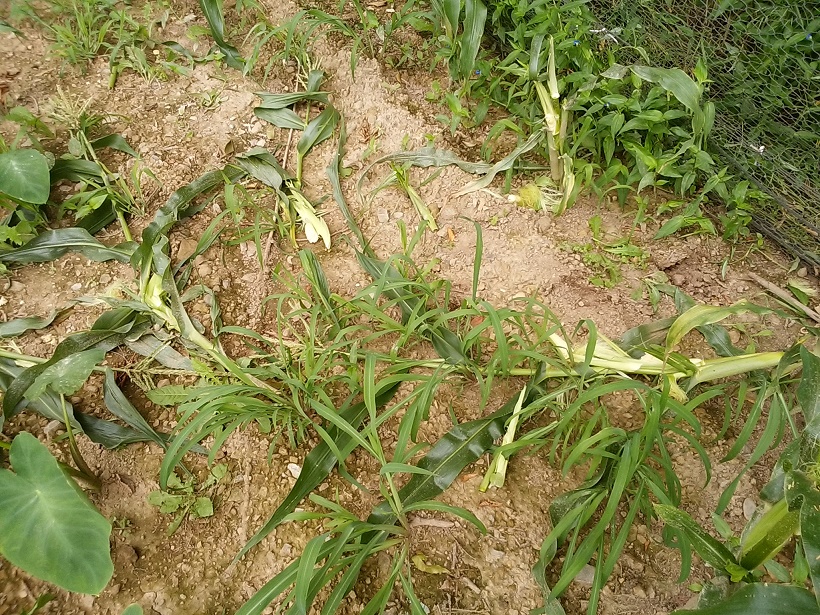 今日は、農園活動日。ハウス内に植えたキャベツの手直しや、ナス、きゅうり、トマトの枝切りをした後、畑に秋採りのトウモロコシの苗を植えようとしたところ、春先に植えたトウモロコシが「ハクビシン」の被害に合い、数本倒れて、実を食べられていました。ネットの隙間から侵入したようです。私たちが口にする前にハクビシンに横取りされてしまいました。ネットをさらに二重に張り、侵入できないようにしましたが、どうなることやら・・・・。