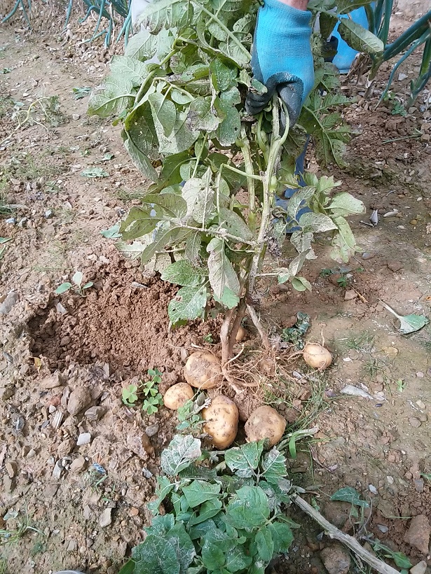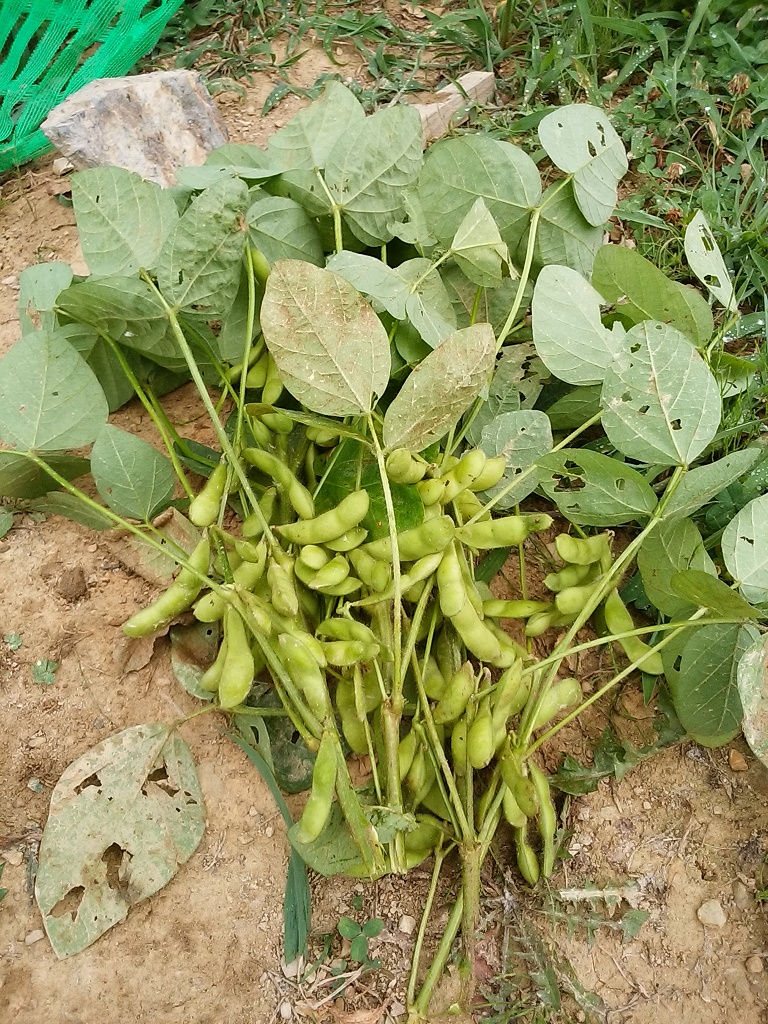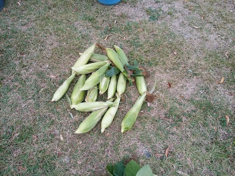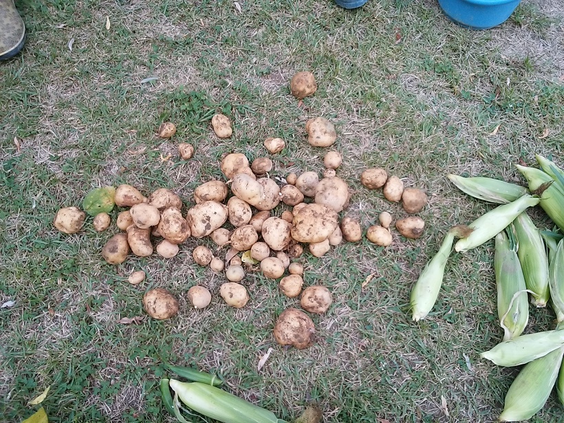 炎天下、トウモロコシ、じゃがいも、枝豆を収穫しました。トウモロコシは、鳥獣ネットを掛けた後はハクビシイからの被害もなく、収穫できました。ジャガイモもまずまずの出来。枝豆(怪傑黒頭巾)もしっかり実が入っていました。