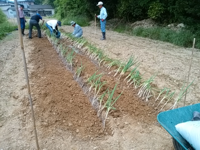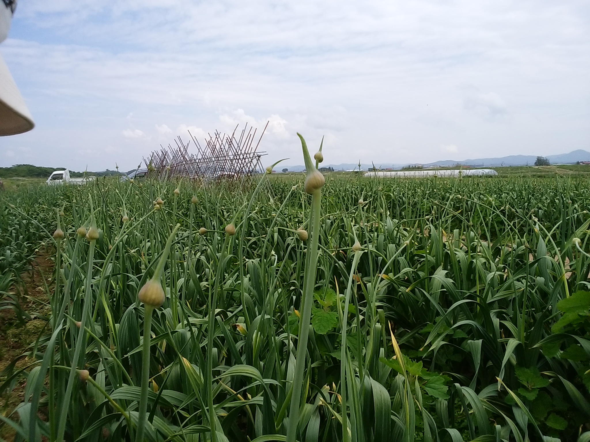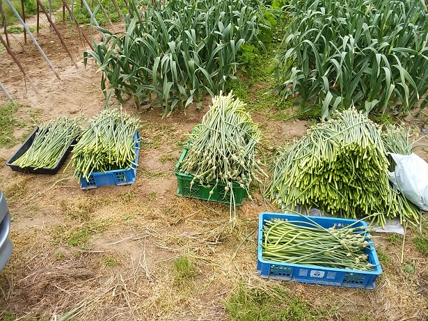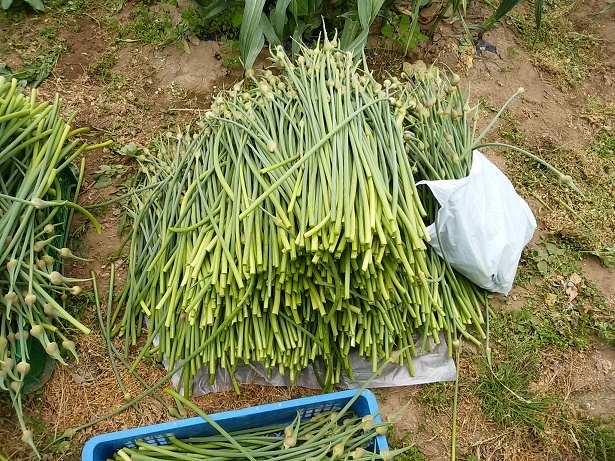 野菜作りの指導を頂いている松本さんの畑でのニンニクの芽の摘み採り。会員の皆さんと行ってきました。暑い中での作業になりましたが今年も沢山いただきました。!(^^)!